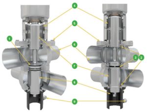 | 3 | Los órganos metálicos controlan el flujo CIP durante la elevación del asiento. | Reduce el consumo de químicos y la pérdida de agua. | |
