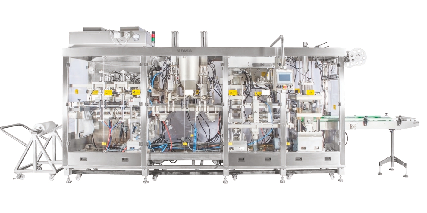 - Máquina automática de termoformado horizontal para crear envases, rellenarlos y sellarlos con papel de aluminio laminado.